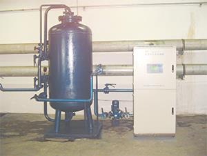 旁流水处理器,由钛电极及外加电压发生器组成。水在电极板组内电解,产生各类杀生因子,CLO2、O、H2O2、CL2、O3、HCLO等;这些物质具有强烈杀生效果,杀灭水系统内的各类微生物,如藻类、细菌等。水流经电极板内的强电场时,水分子发生变化,偶板矩增大,正负离子排烈整齐,使系统管道及设备不长垢,同时使已经结上去的水垢脱落,完成防垢、除垢任务。活性氧在管道上生成氧化膜,保护设备不被进一步腐蚀;细菌、藻类被杀死,微生物腐蚀被抑制。因多介质过滤器的作用,系统内淤泥等各类沉积物被去除,系统内局部腐蚀被清除,同时水质清澈、透明。